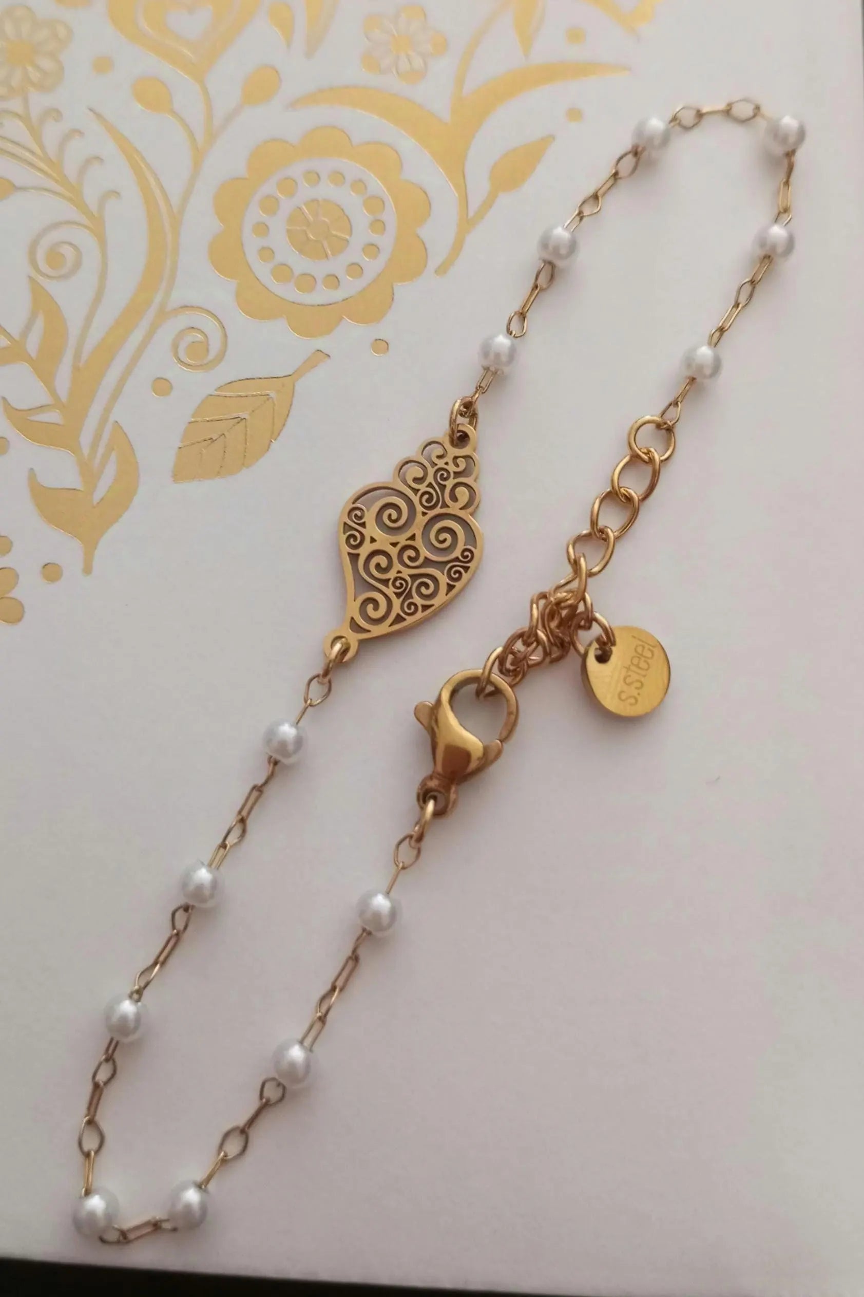 Goldplated Stainless Steel Bracelet with Filigree Style Heart of Viana and Faux White Pearls