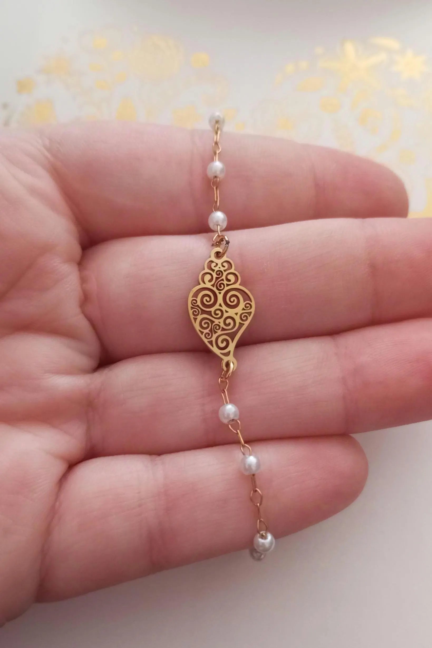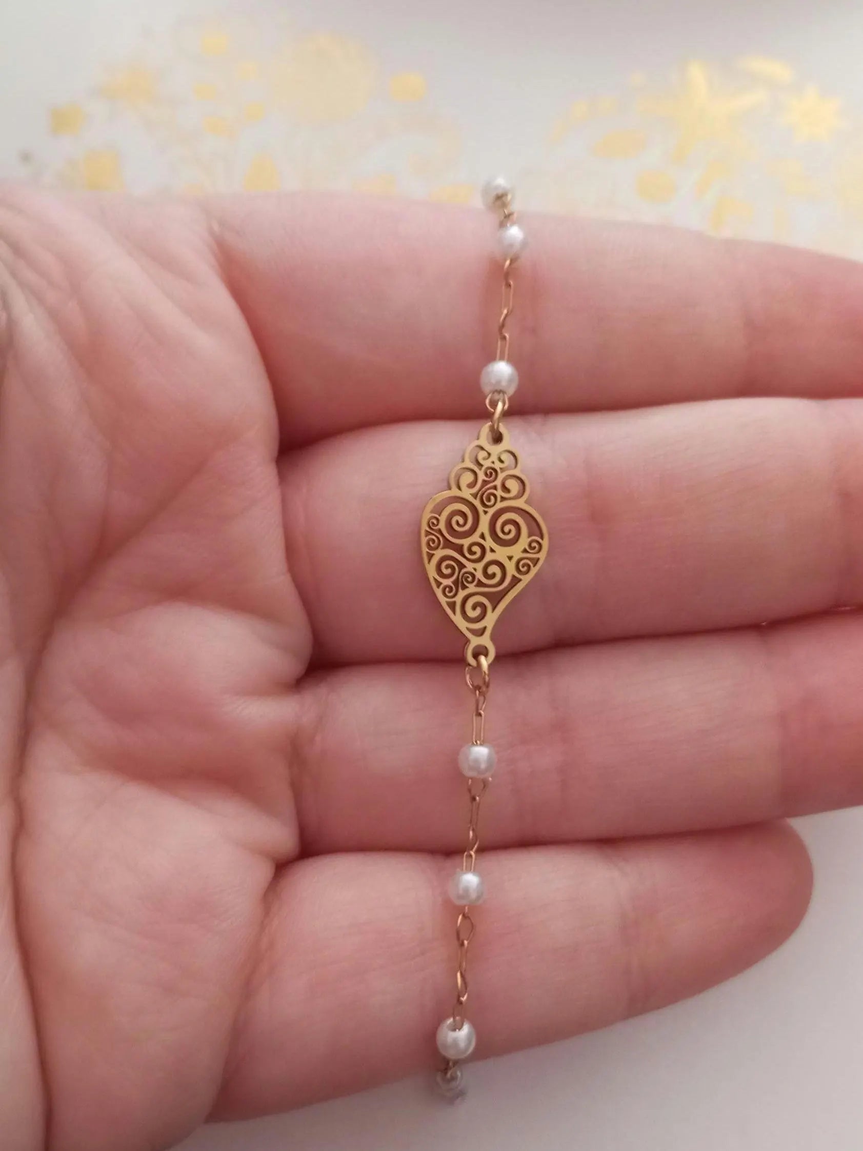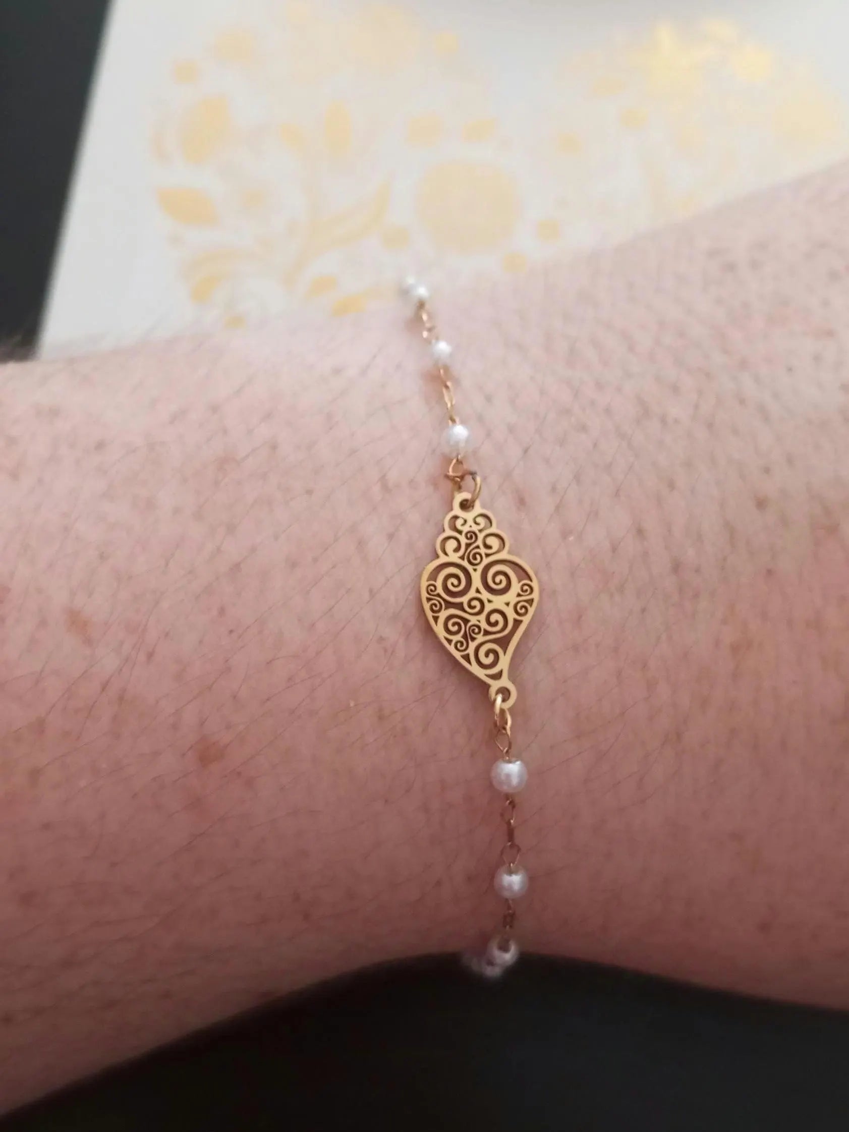 Linda pulseira feita traditionnelle à la main, banhada a ouro, en aço inoxidável, com pequenas perolas brancas artificiais, in estilo Chapelet, et realçada com a linda peça central em estilo filigrana portuguesa, o Coração de Viana.