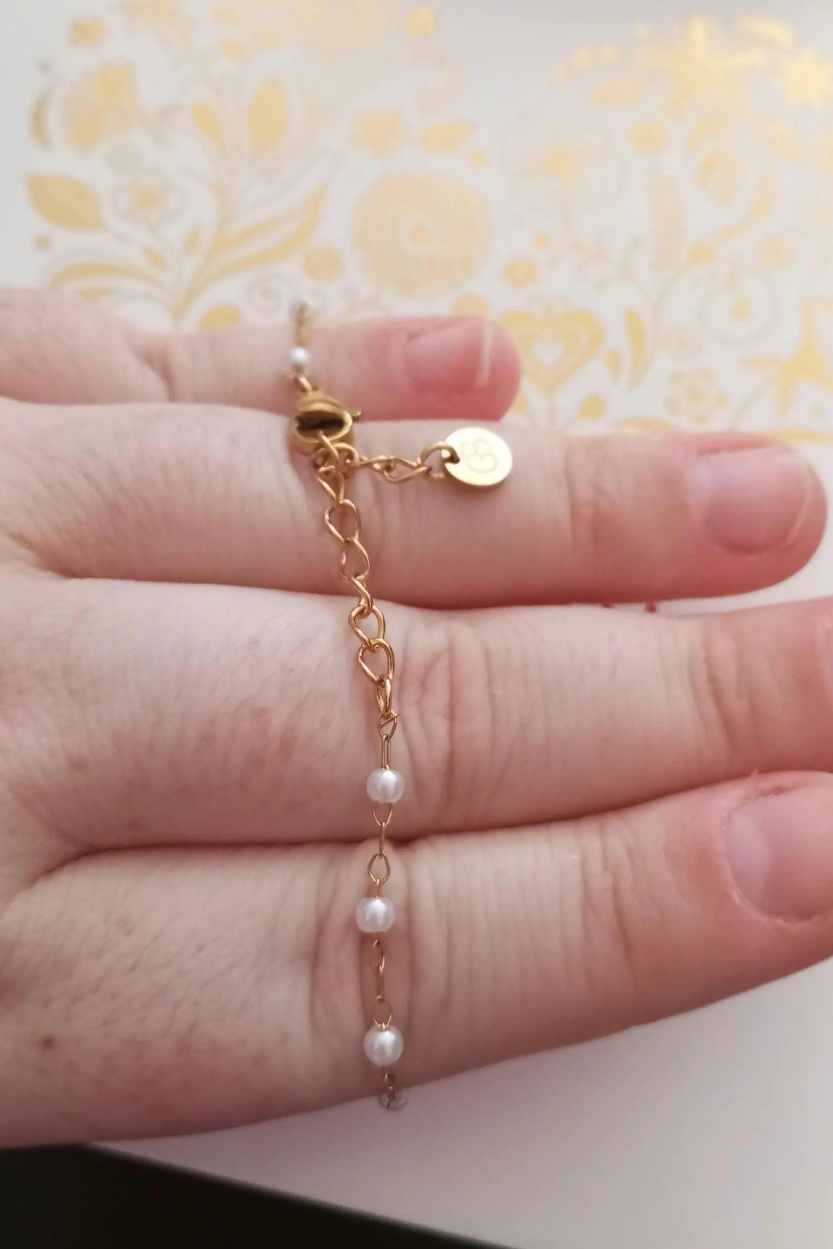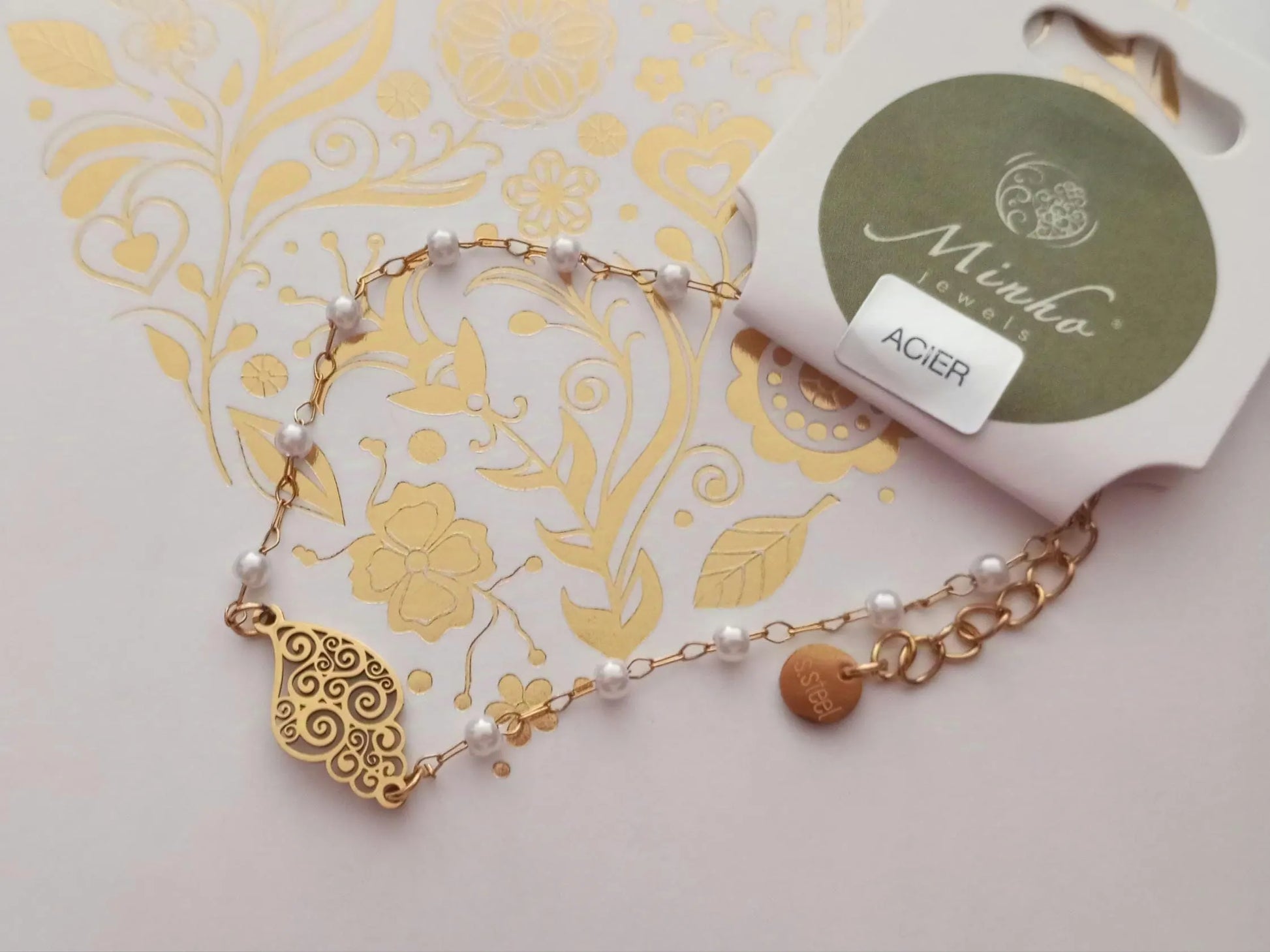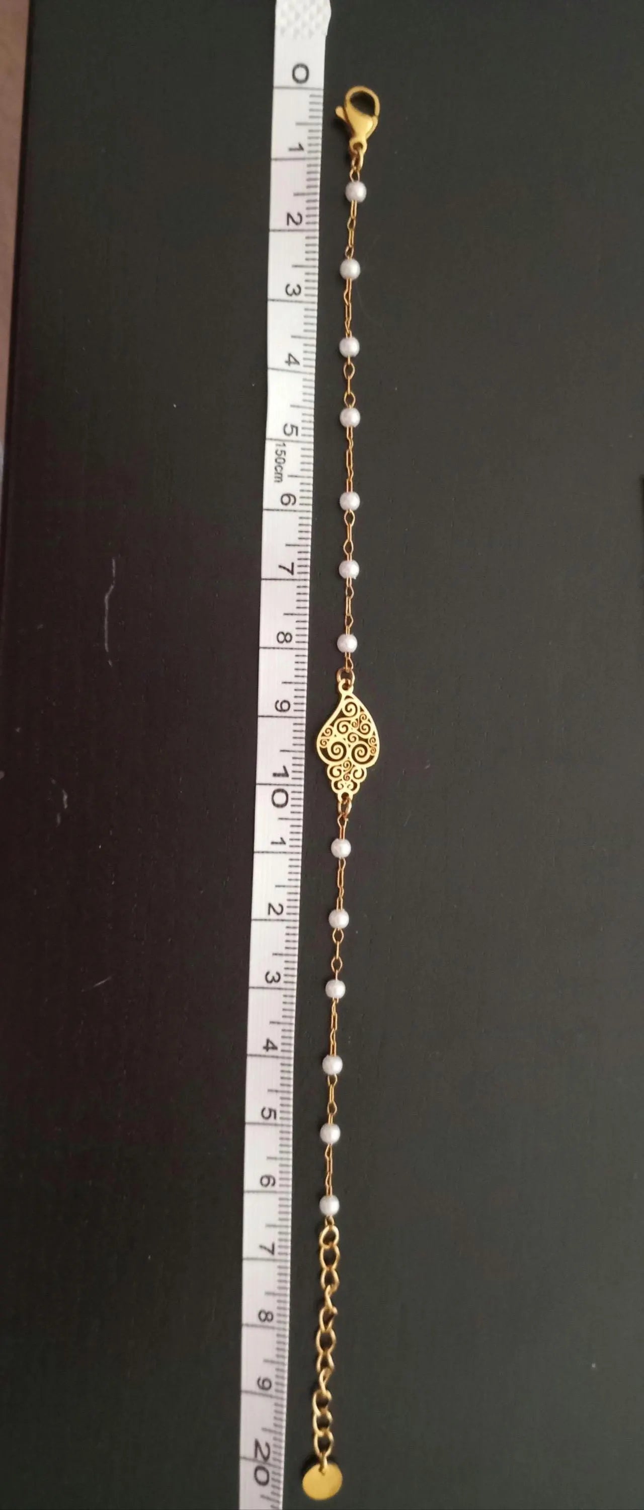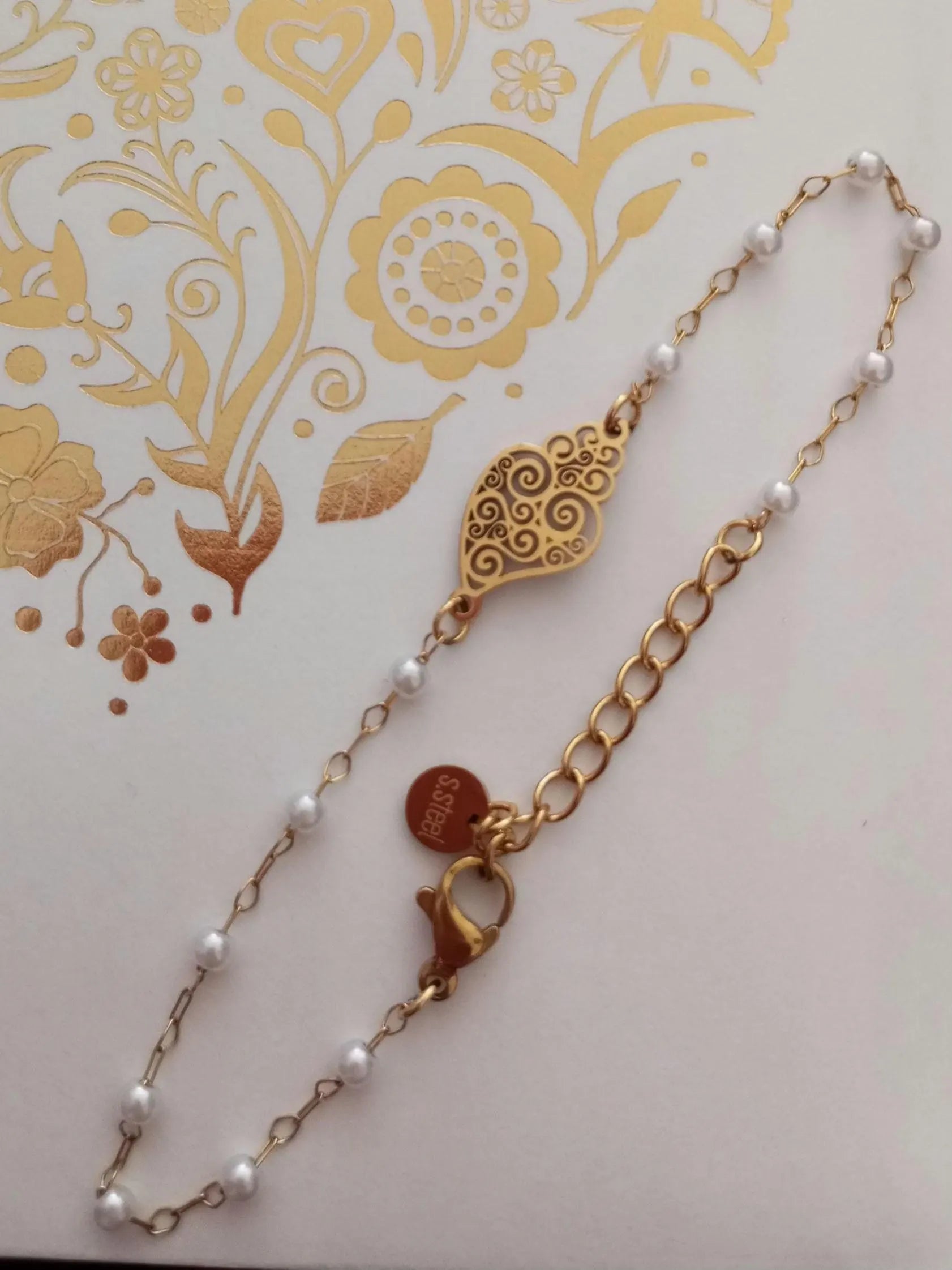 Linda pulseira feita traditionnelle à la main, banhada a ouro, en aço inoxidável, com pequenas perolas brancas artificiais, in estilo Chapelet, et realçada com a linda peça central em estilo filigrana portuguesa, o Coração de Viana.