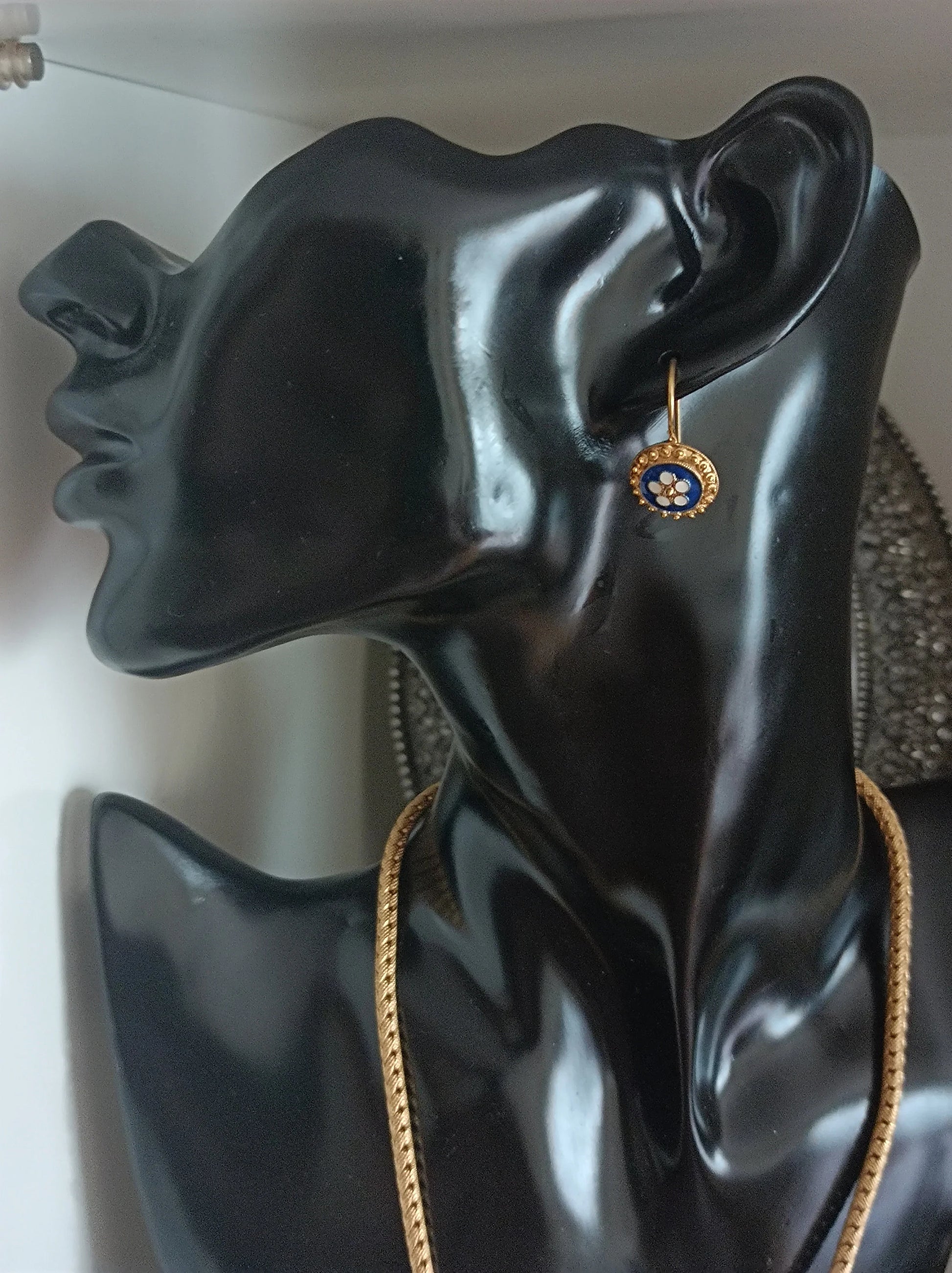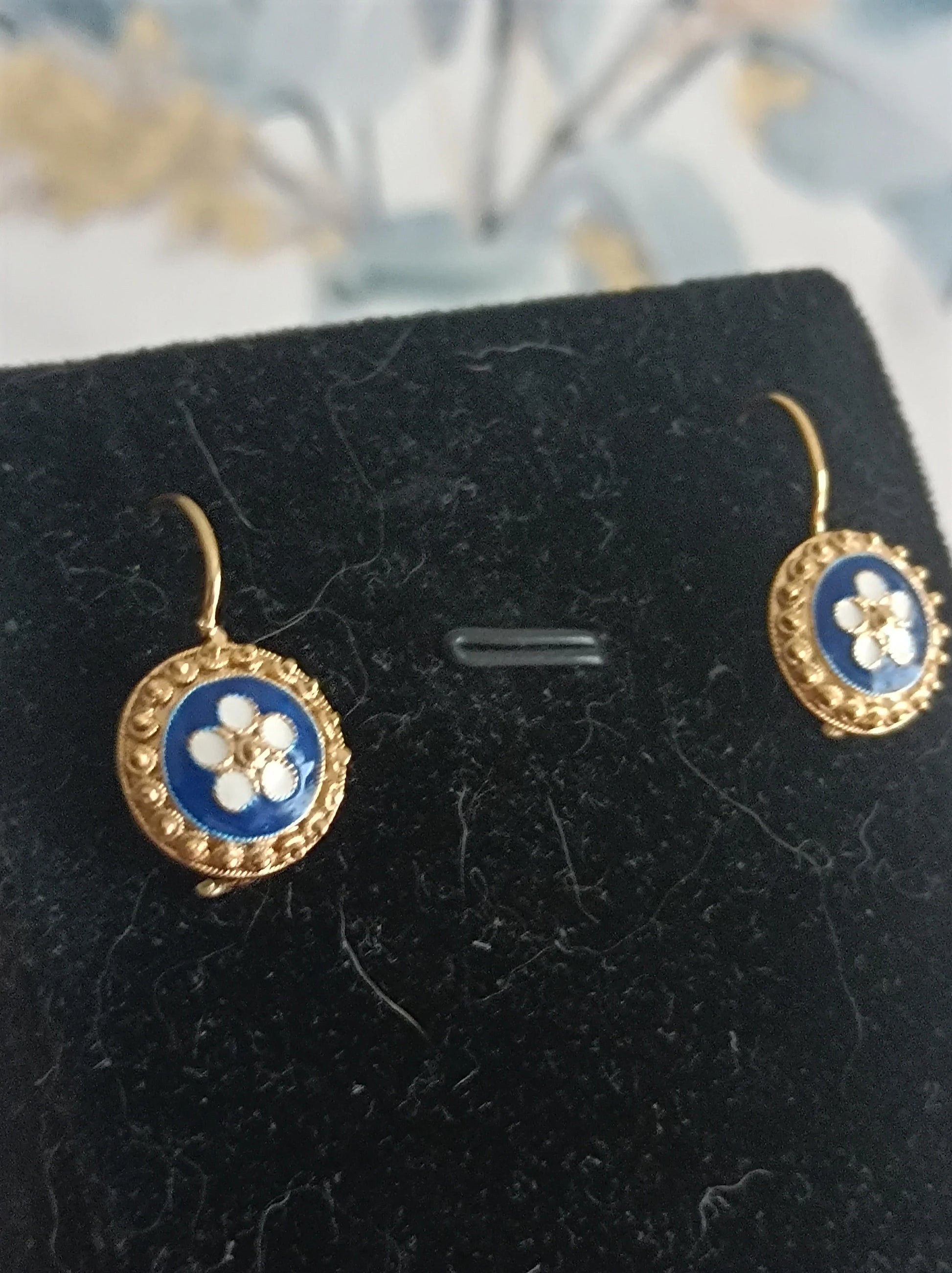 Beautiful traditional Earrings for Her, in handmade Vermeil Silver Portuguese Filigree , painted with blue and white Enamel with a floral pattern. It's a very iconic Jewellery Style from the Minho Region called "Caramujo".