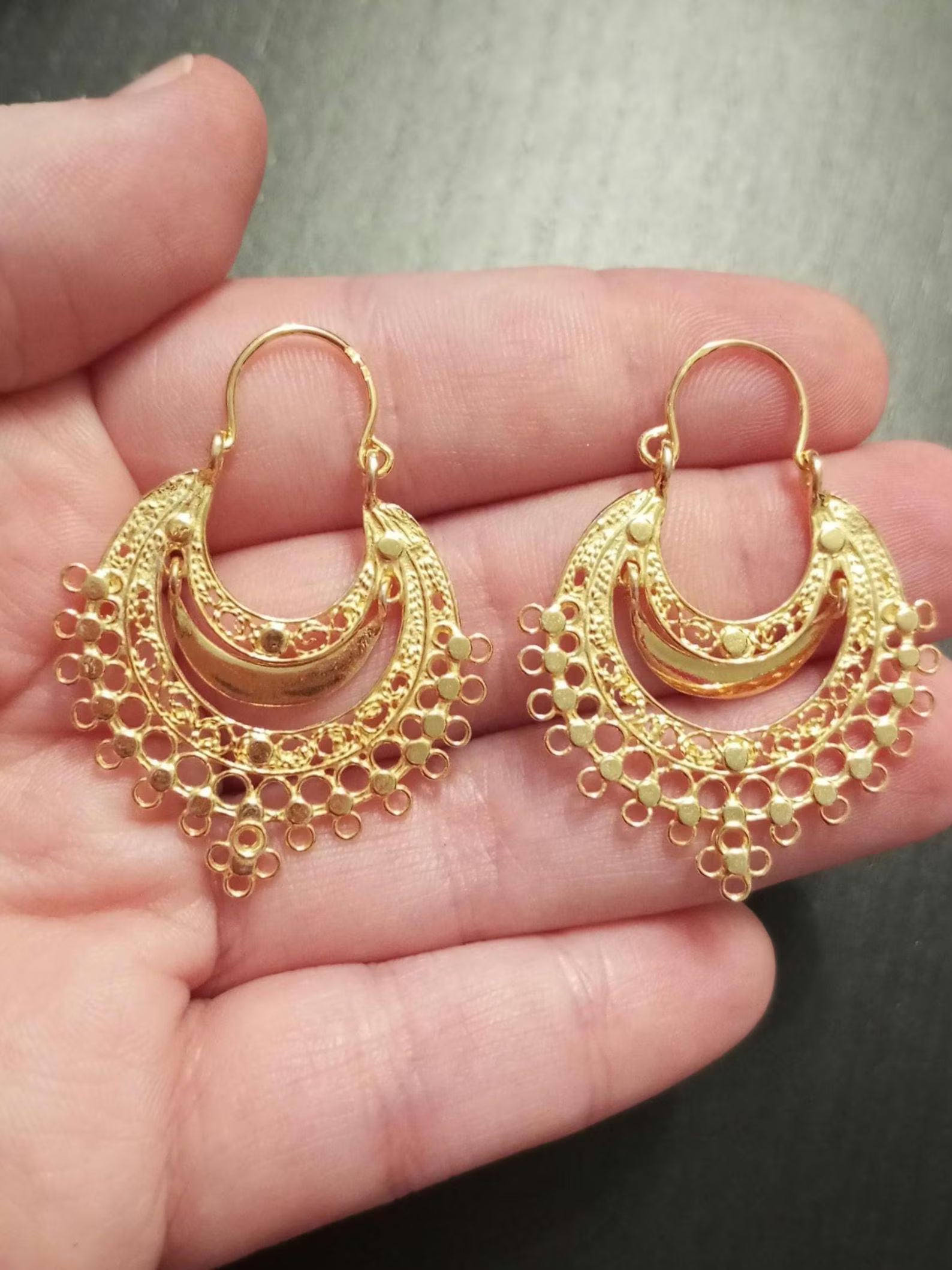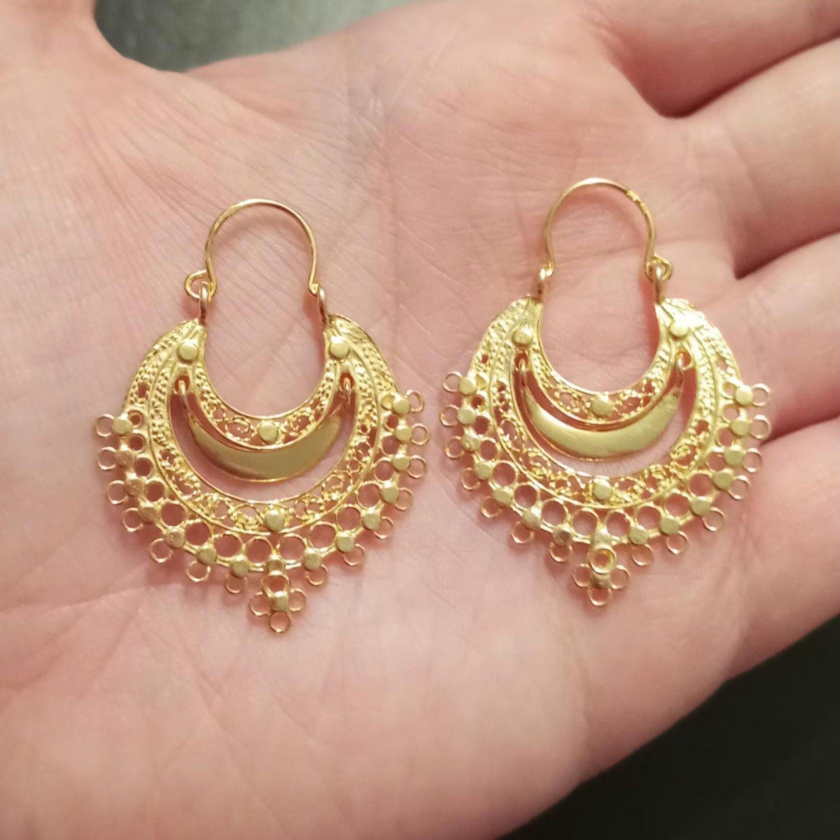 Brincos de argola em filigrana dourada, feitos à mão, estilo Arrecadas, joalharia tradicional portuguesa.