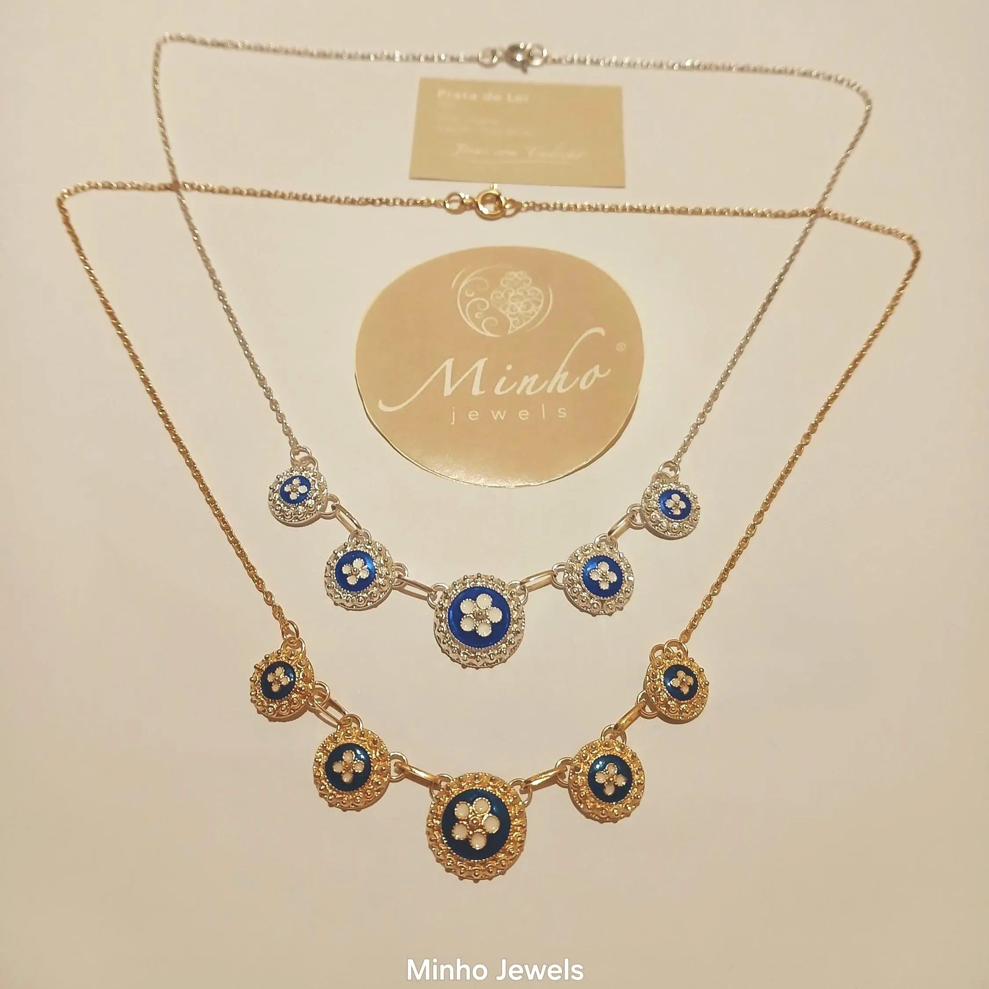 Beautiful traditional necklace for Her, in Goldplated Sterling Silver / Gold Vermeil, properly hallmarked. 100% Handmade by Portuguese Filigree Technique and also painted by hand with blue and white Enamel in a floral pattern design that accentuates the cleavage perfectly with its 5 motifs, increasing in size.